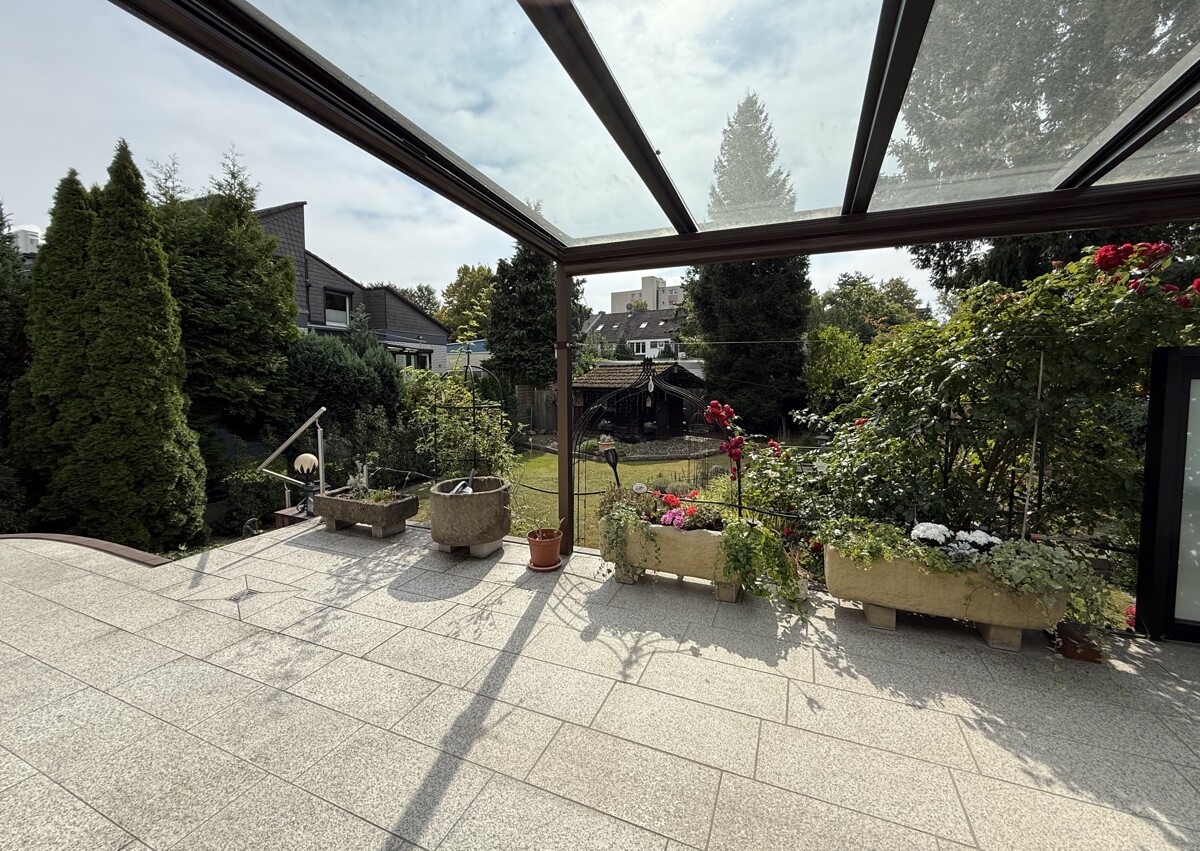Ein Wintergarten und eine teil überdachte Terrasse mit Blick in den Garten lädt zum Entspannen ein.