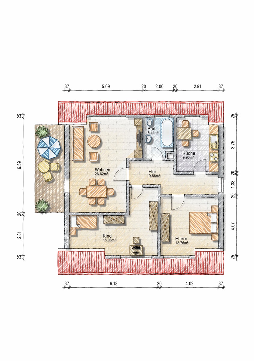 Der Grundriss der Wohnung setzt sich aus einem großzügigen Wohnzimmer, einem Schlafzimmer, der geräumigen Küche mit Einbauten, einem Kinderzimmer, sowie dem Tageslichtbad mit Badewanne zusammen.