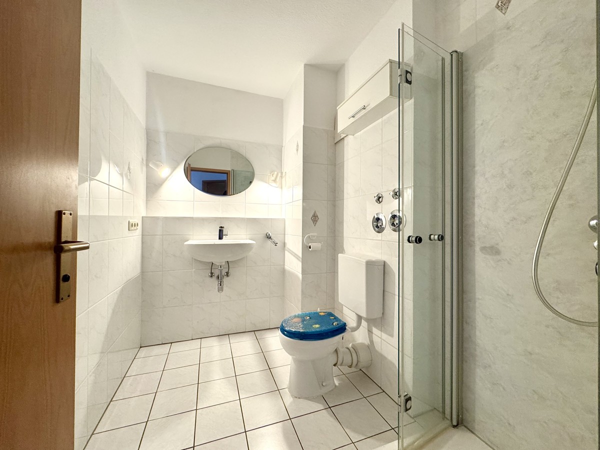 Das innenliegende Badezimmer ist funktional ausgestattet mit einer ebenerdigen Dusche, WC und Waschbecken.