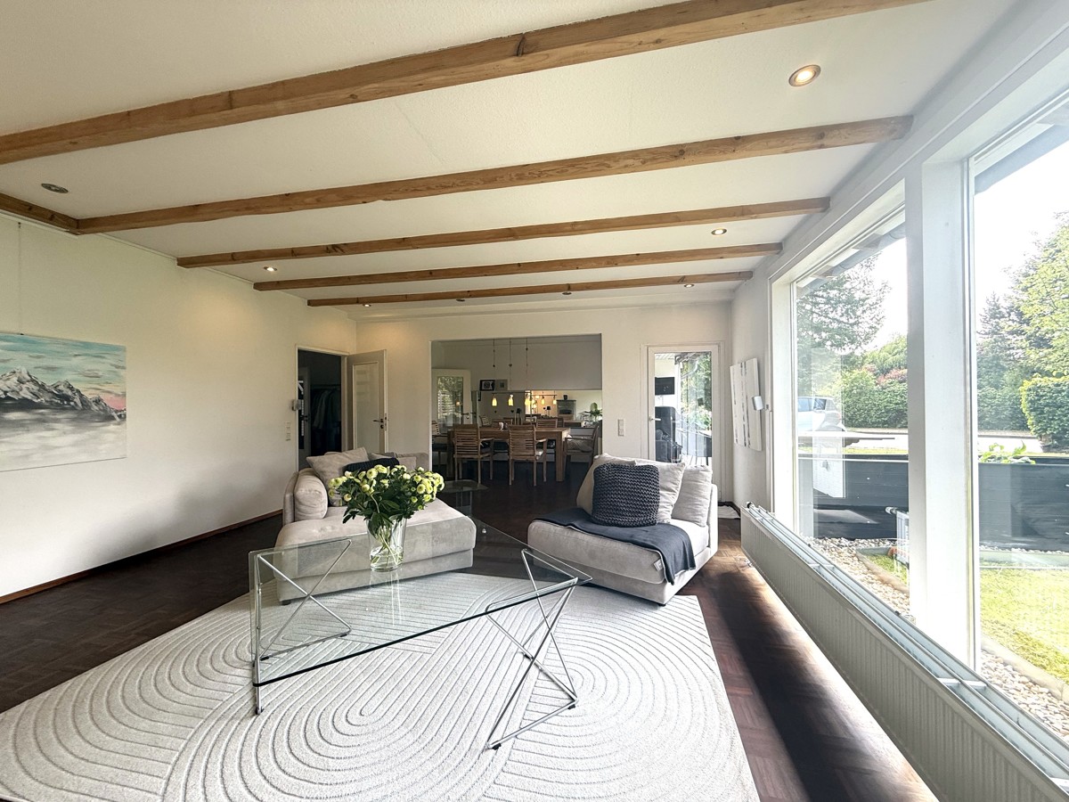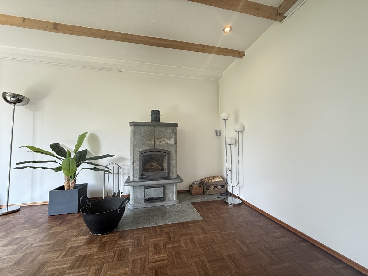 Das Highlight des Hauses ist der lichtdurchflutete Wohn-/Essbereich, der mit einem geschmackvollen Parkettboden ausgestattet wurde. Durch die bodentiefe Fensterfront strömt viel Tageslicht in den Raum, der zudem einen direkten Zugang auf die süd-westlich ausgerichtete Terrasse und den Garten bietet. Der Raum verfügt über über einen Kaminofen, der in kalten Tagen eine gemütliche Raumatmosphäre schafft.