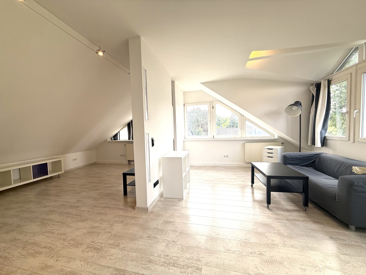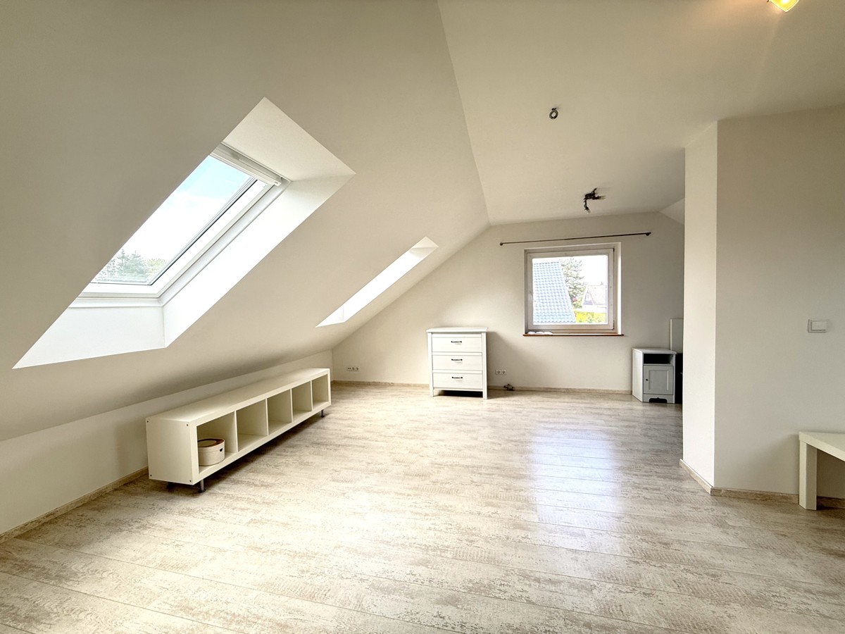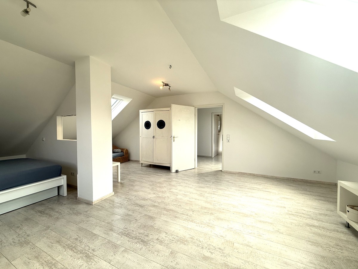 Das Obergeschoss ist über eine offene Treppe erreichbar. Hier befinden sich zwei sehr helle und architektonisch individuell geschnittene Räume und ein Tageslichtbad mit Dusche, die von einem separaten Flur erreichbar sind.