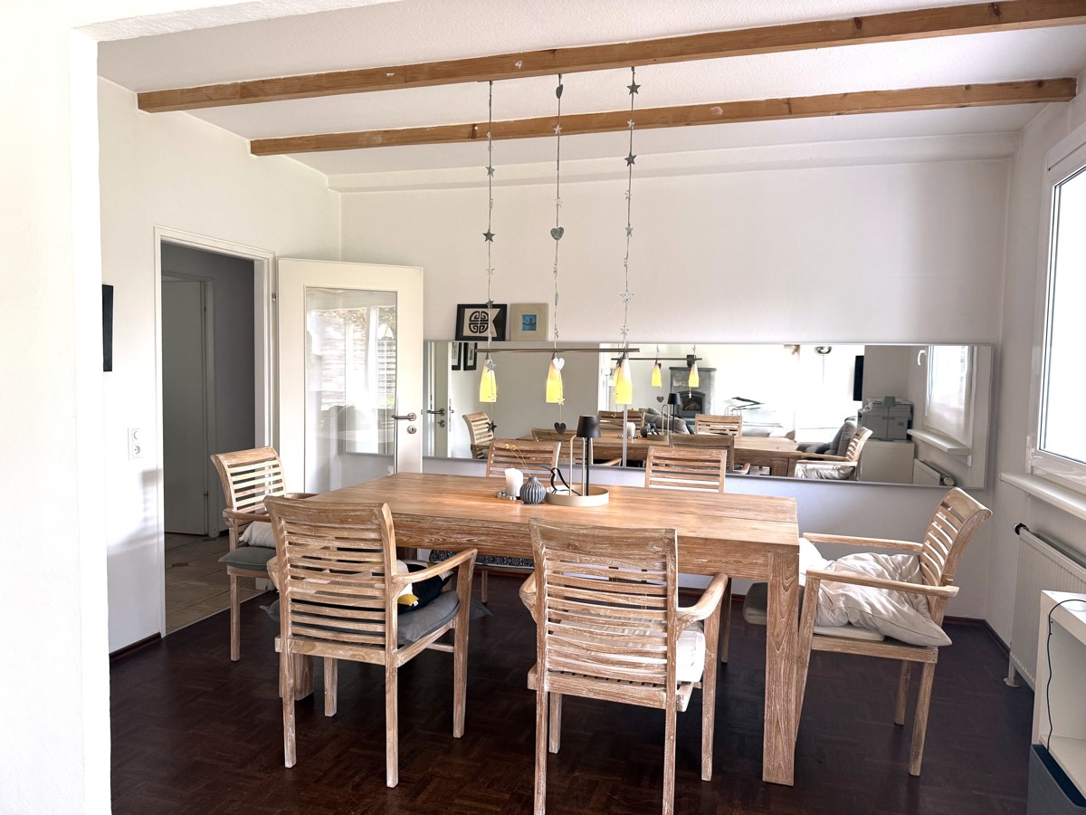 Das Highlight des Hauses ist der lichtdurchflutete Wohn-/Essbereich, der mit einem geschmackvollen Parkettboden ausgestattet wurde. Durch die bodentiefe Fensterfront strömt viel Tageslicht in den Raum, der zudem einen direkten Zugang auf die süd-westlich ausgerichtete Terrasse und den Garten bietet. Der Raum verfügt über über einen  Kaminofen, der in kalten Tagen eine gemütliche Raumatmosphäre schafft.