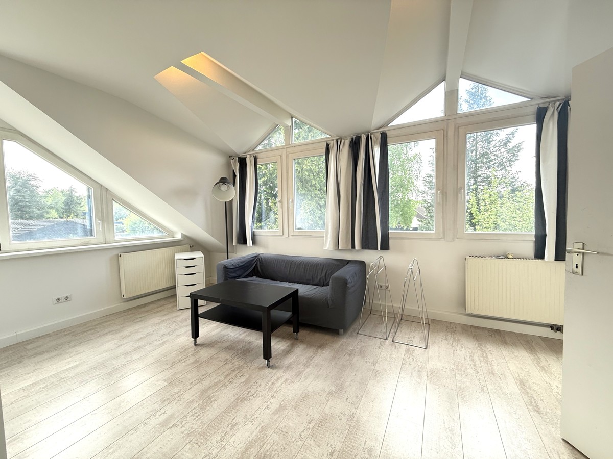 Das Obergeschoss ist über eine offene Treppe erreichbar.  Hier befinden sich zwei sehr helle und architektonisch individuell geschnittene Räume und ein Tageslichtbad mit Dusche, die von einem separaten Flur erreichbar sind.
