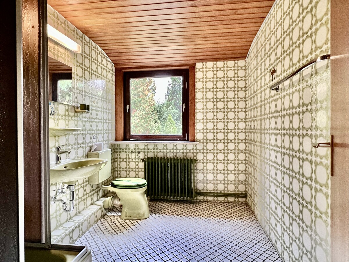 Zur Linken befindet sich der Treppenaufgang in das Obergeschoss. Dieses ist durch eine Tür verschließbar. Direkt daneben befindet sich das Tageslichtbadezimmer mit Badewanne.