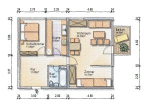 Das Wohnzimmer mit Essbereich umfasst etwa 35 m², das Schlafzimmer ca. 10 m² und die Küche rund 10 m².