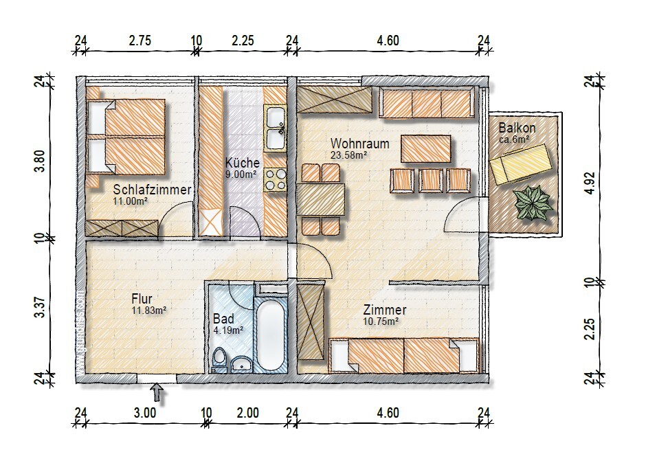 Beim Betreten der Wohnung gelangen Sie in den großzügigen ca. 10 m² großen Eingangsbereich, durch den alle Räume bequem erreichbar sind.
