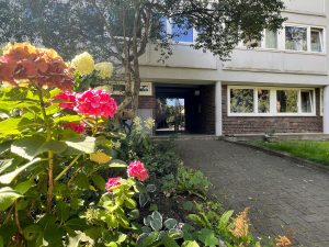 Die Wohnung liegt im 1. Obergeschoss eines gepflegten Mehrfamilienhauses aus dem Jahr 1962, das sich auf zwei Gebäude mit insgesamt 36 Wohneinheiten verteilt.