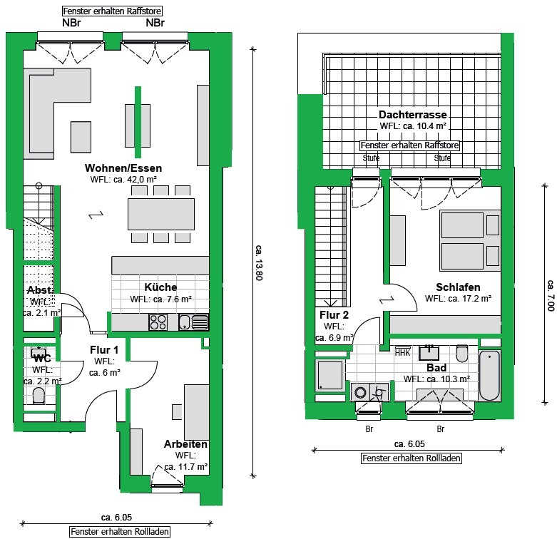 Neben einem großzügigem Wohn- und Esszimmer mit offener Küche, befindet sich in der unteren Etage ein Büro, oder Gästezimmer und ein Gäste-WC. Das Obergeschoss verfügt über ein Tageslichtbadezimmer mit Dusche, Badewanne und Waschmaschinenanschluss, sowie über das geräumige Schlafzimmer mit Zugang zur Dachterrasse.