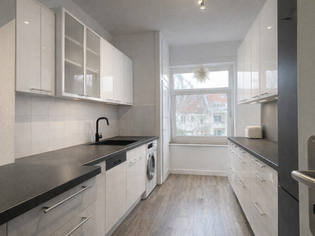 Zur linken Seite gelangen Sie in das Tageslichtbadezimmer mit Badewanne. Gleich nebenan befindet sich die geräumige Küche mit Zugang auf den Balkon.