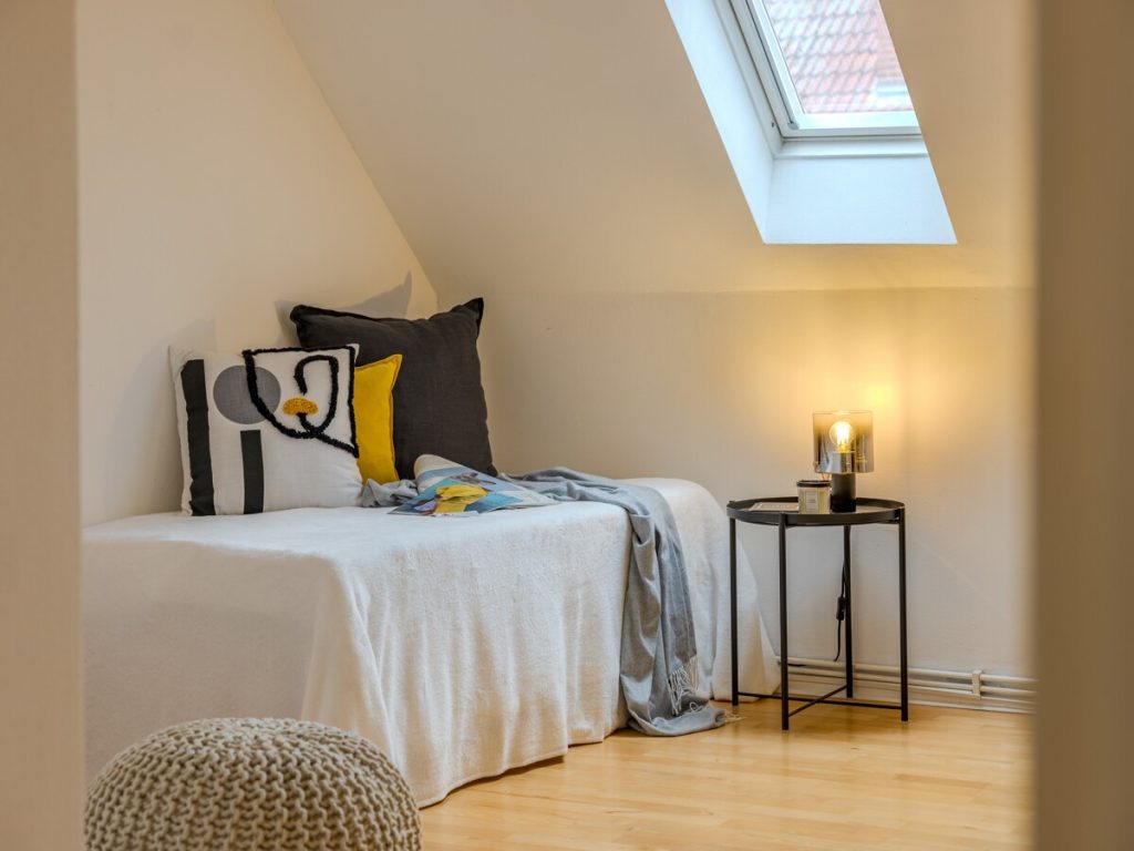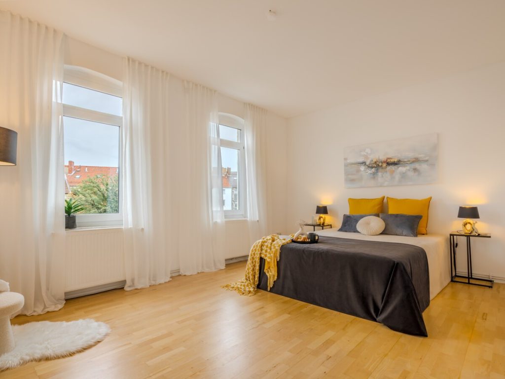 Am Ende des Flures erwartet Sie das lichtdurchflutete Schlafzimmer mit zwei großen Fenstern, die am Morgen viel Sonnenlicht hereinlassen.