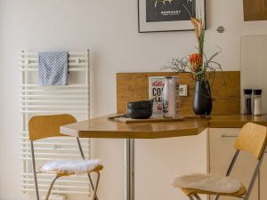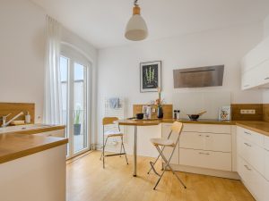 Die ca. 13 m² große Küche ist mit zeitlos modernen Einbauten sowie hochwertigen Elektrogeräten von Bosch und AEG ausgestattet. Von hier aus gelangen Sie direkt auf den 2017 angebauten Balkon mit ca. 14 m² Fläche.