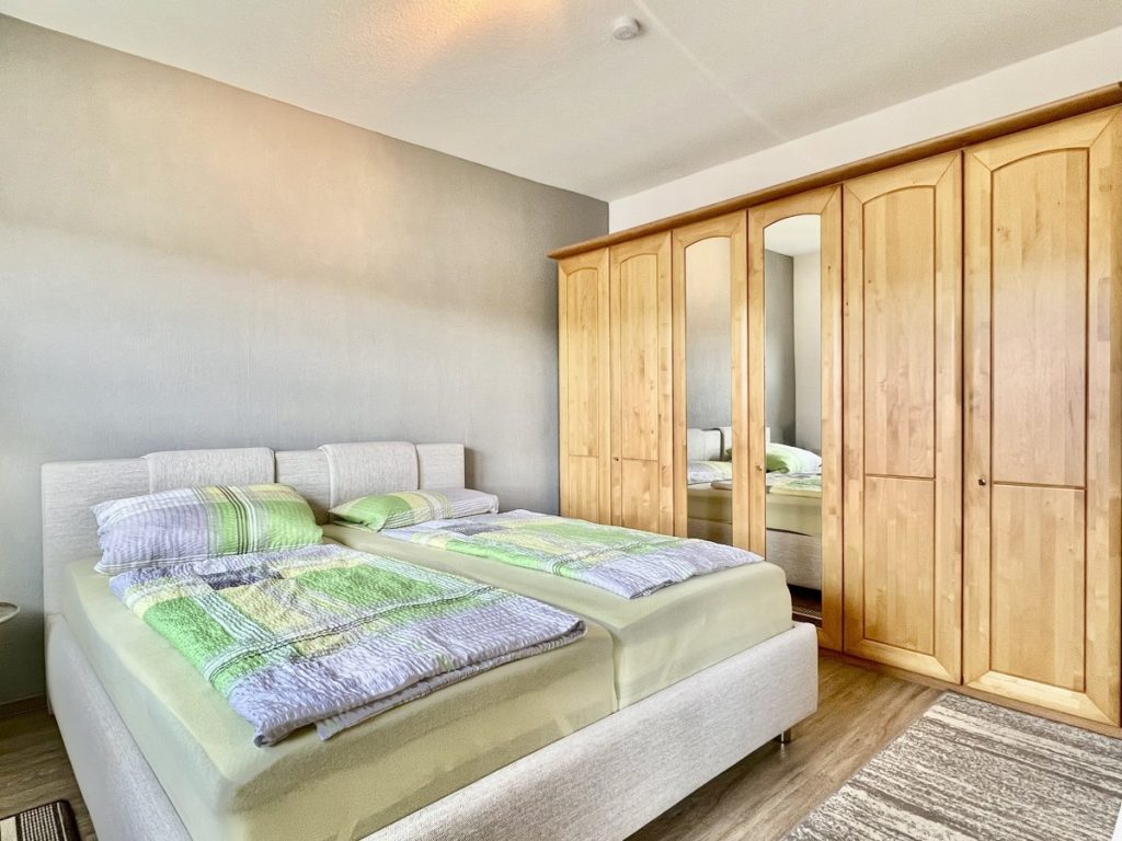 Ein hell gefliestes Tageslichtbad mit Dusche sowie der Schlafbereich schließen sich an. Durch ein aktuell als Ankleidezimmer genutztes Zimmer gelangen Sie sowohl in das Schlafzimmer als auch in einen praktischen Abstellraum.