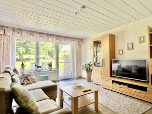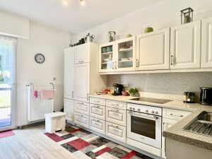 Die Wohnung im Erdgeschoss bietet mit ca. 85 m² Wohnfläche einen durchdachten Grundriss mit hohem Wohnkomfort. Links vom Eingangsbereich befinden sich die Küche sowie das großzügige Wohnzimmer. Beide Räume verfügen über Terrassentüren, die einen direkten Zugang auf die Terrasse und in den Garten ermöglichen. Von der Küche erreichen Sie außerdem das angrenzende Esszimmer.