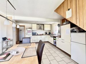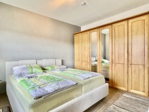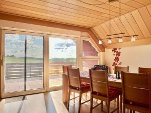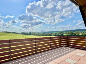 Im Obergeschoss befindet sich die zweite Wohneinheit. Der großzügige, offen gestaltete Wohn- und Essbereich überzeugt durch seine Weitläufigkeit und den Zugang zum großen Balkon. Dieser bietet nicht nur ausreichend Platz für entspannte Stunden im Freien, sondern auch einen traumhaften Weitblick über die umliegende Landschaft. Zwei ruhige Schlafzimmer, eine geräumige Küche mit Platz für einen Essbereich, ein Tageslichtbad mit Badewanne sowie ein weiteres Zimmer, welches sich ideal als Büro geeignet, runden das Raumangebot dieser Einheit ab.