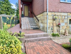 Beim Betreten der Immobilie gelangen Sie zunächst durch einen Windfang in den zentralen Hausflur. Zur linken Seite befindet sich der Zugang zur Erdgeschosswohnung, während rechts die Treppe in das Obergeschoss führt.