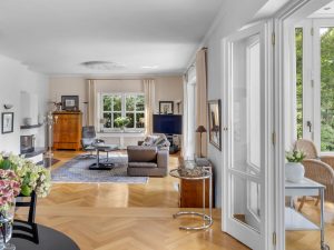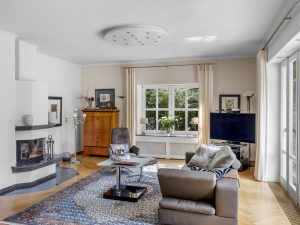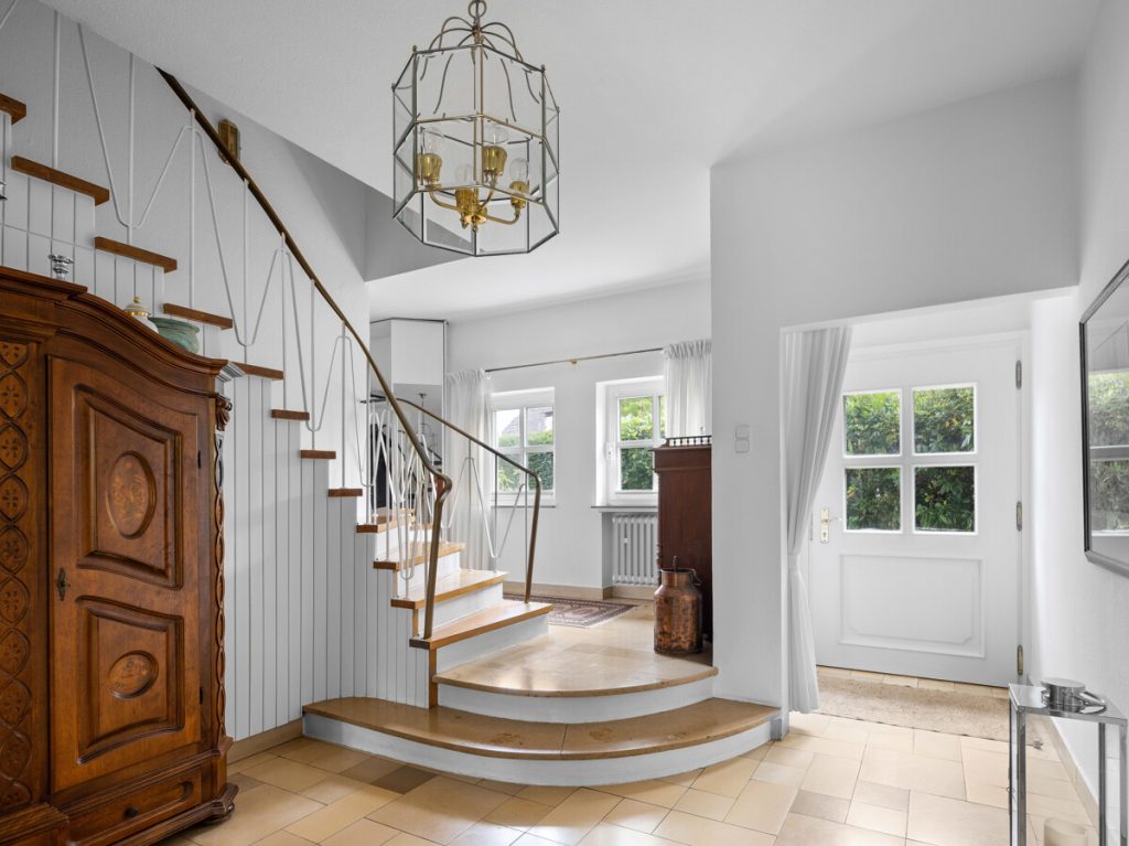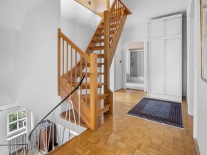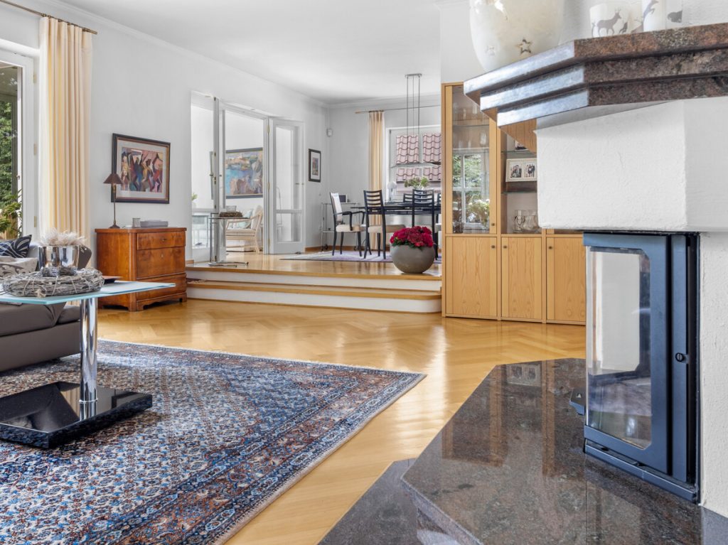 Beim Betreten des Hauses heißt Sie ein großzügiger Empfangsbereich willkommen, der Sie direkt in den offenen Wohn- und Essbereich führt, welcher mit einem Kamin und hochwertigen Eiche-Echtholzparkett ausgestattet ist.