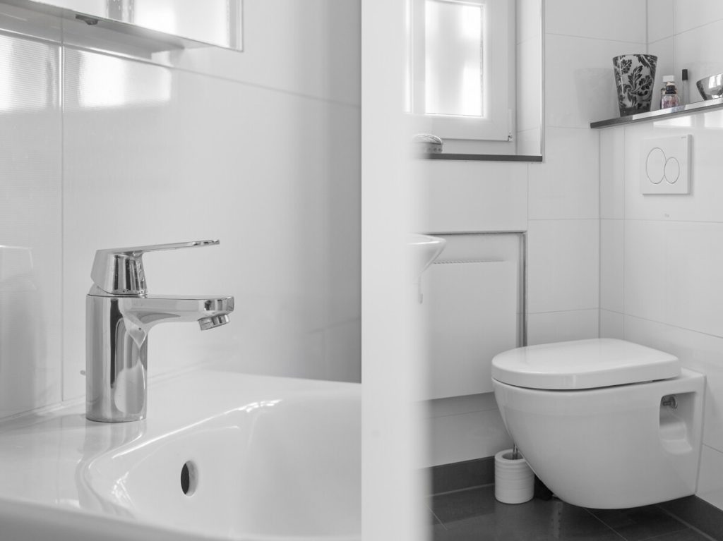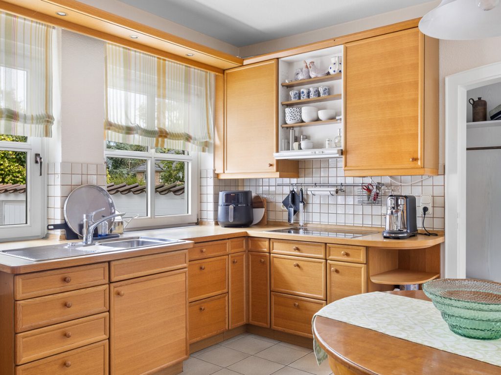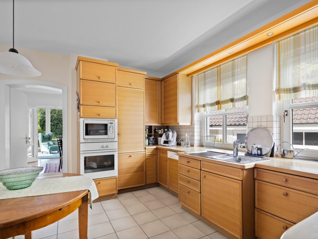Angrenzend am Essbereich befindet sich eine helle Küche inkl. einer Einbauküche. Ein modernes Gäste-WC sowie ein Arbeitszimmer vervollständigen das Raumangebot dieser Wohnebene.
