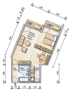 Der ca. 40 m² Wohn- Schlaf- und Essraum ist mit hochwertigen Bodenziegeln versehen.