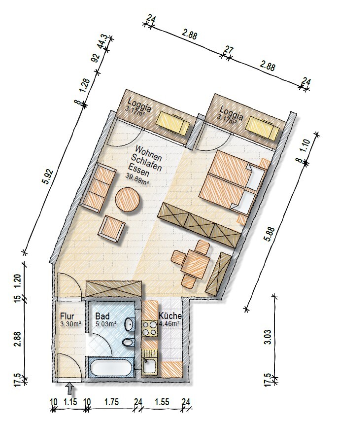 Der Grundriss der Wohnung verteilt sich auf ca. 55 m² Wohnfläche.