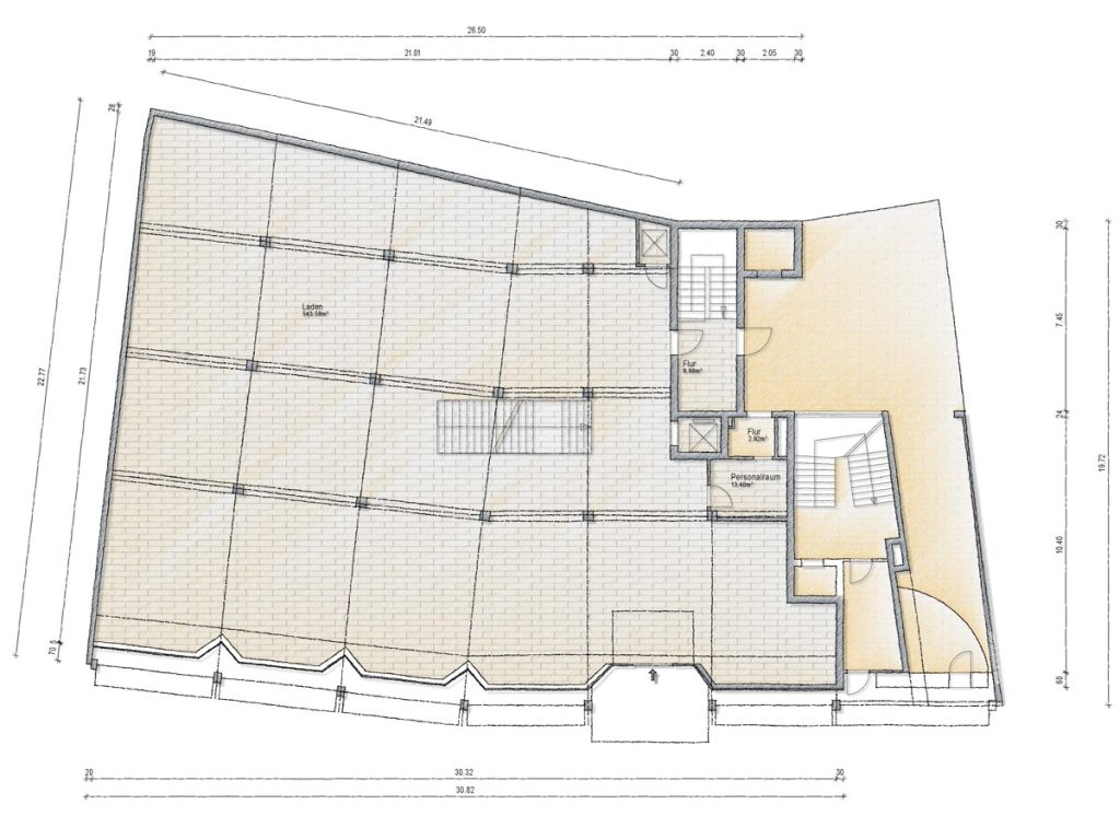 Insgesamt umfasst die Fläche rund 1.065 m² und teilt sich in ca. 560 m² im Erdgeschoss mit großzügiger Ladenfläche sowie ca. 505 m² im Untergeschoss mit Lager- (ehemalig Verkaufs-Etage bzw. Showroom), Neben- und Sozialräumen.