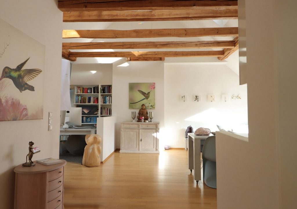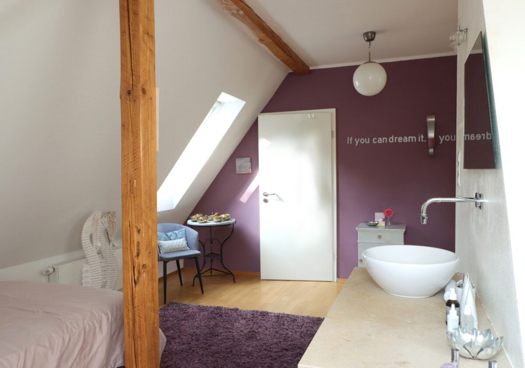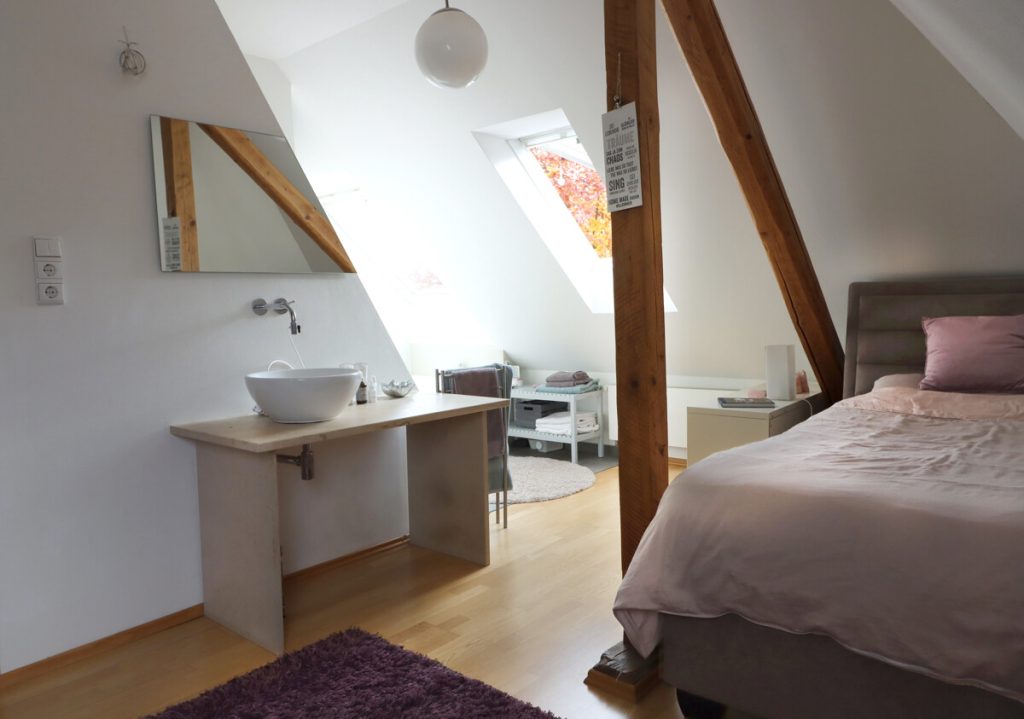 Auf der rechten Seite der Wohnung liegt ein weiterer Raum, der derzeit als Schlafzimmer mit Wellnesscharakter gestaltet ist. Freigelegte Holzbalken verleihen diesem Bereich eine warme Atmosphäre. Ein integrierter Waschtisch sowie eine Badewanne schaffen ein wohnliches Ambiente.