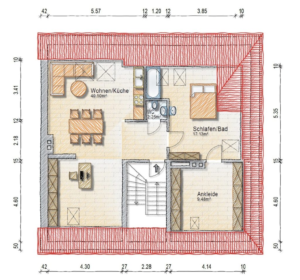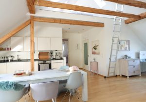 Bereits beim Betreten der Wohnung wird der Loftcharakter spürbar. Der offene Grundriss und die sichtbaren Dachschrägen verleihen den Räumen eine besondere Atmosphäre.
