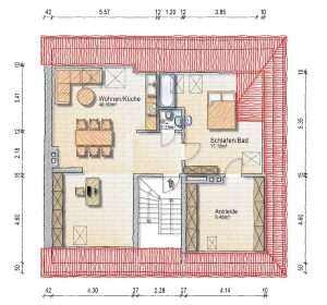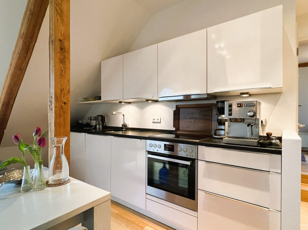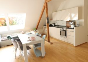 Der Wohn- und Kochbereich bildet das Zentrum der Wohnung. Große Velux-Dachfenster sorgen für viel Tageslicht und unterstreichen das luftige Raumgefühl. Eine zweite Ebene mit Dachnische erweitert die Nutzungsmöglichkeiten und bietet zusätzlichen Rückzugsraum.
