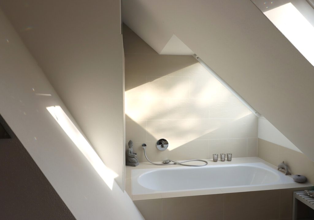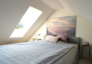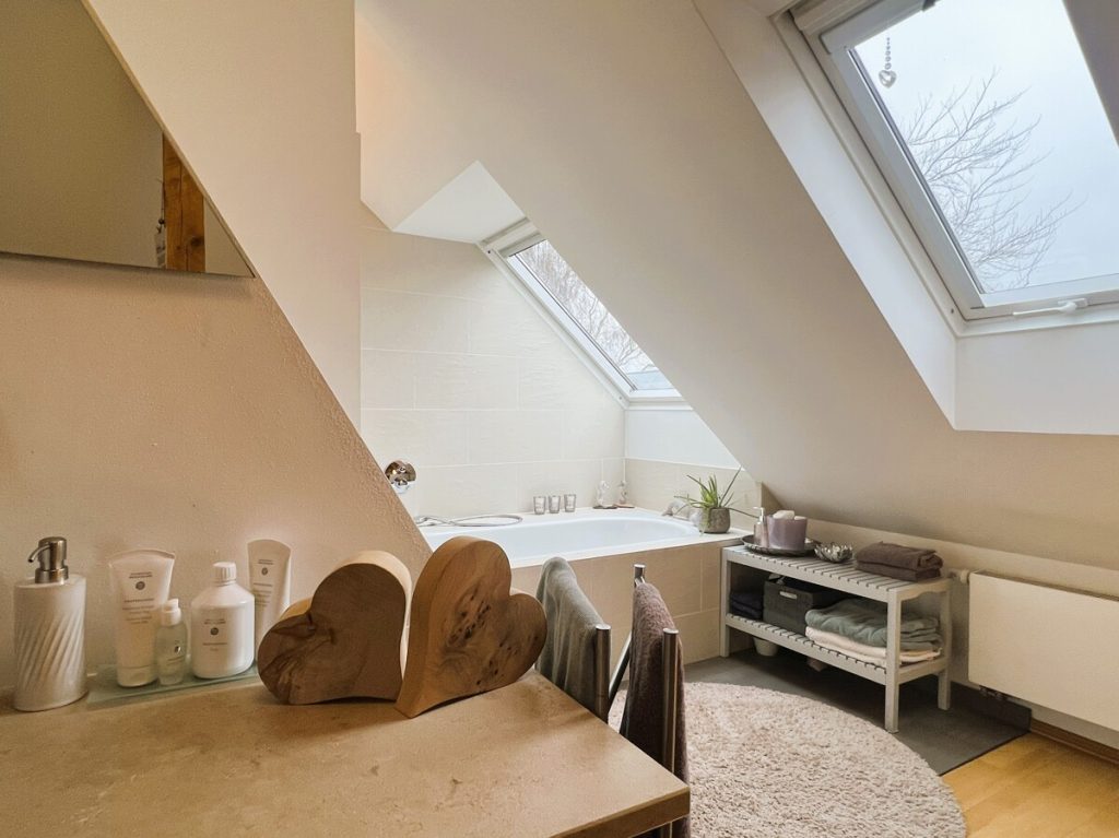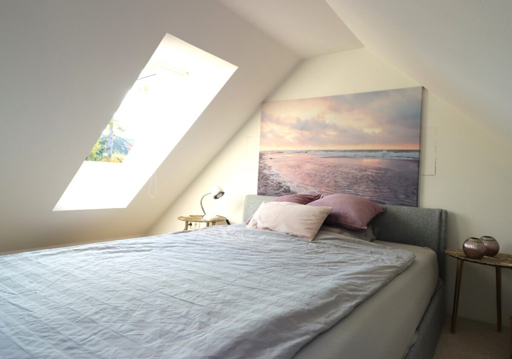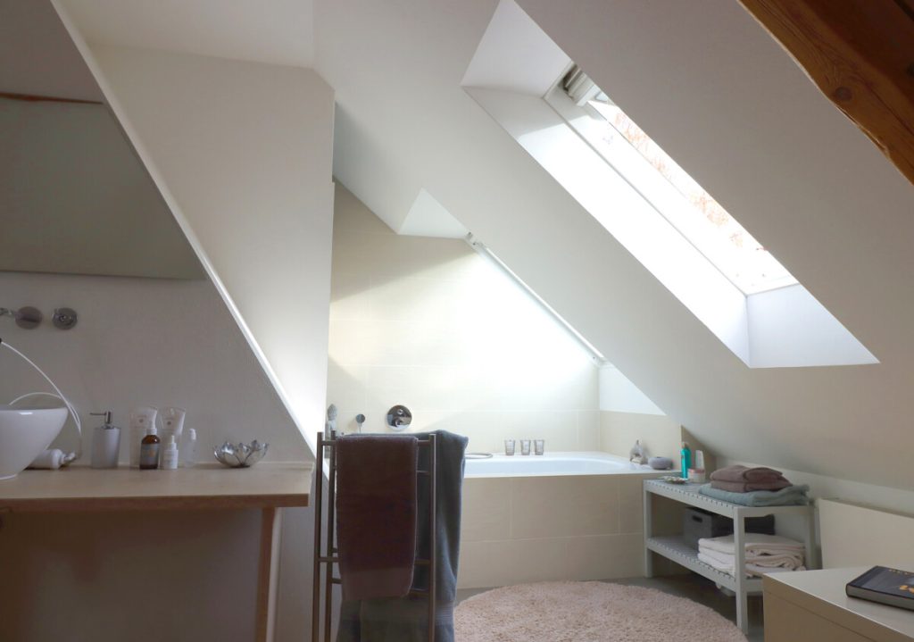 Großzügige Velux-Dachfenster mit Schwingklappen sorgen für viel Tageslicht und eine helle Wohnatmosphäre.