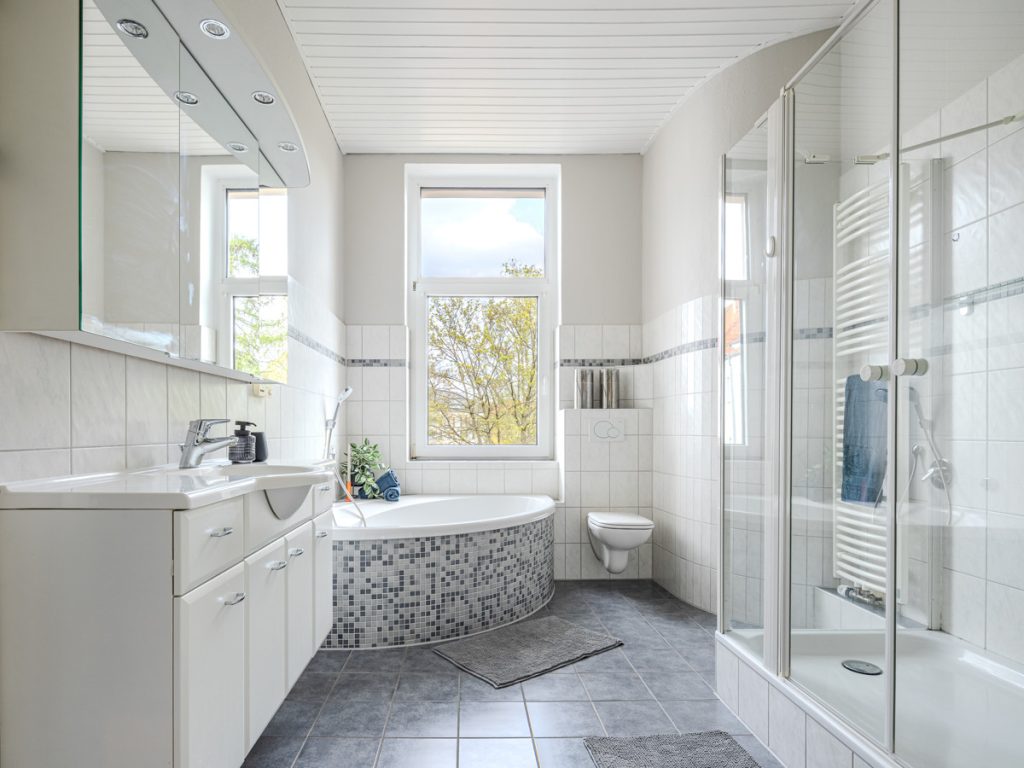 Das ca. 10 m² große Badezimmer wurde im Jahr ca. 2010 umfassend saniert und überzeugt mit einer großzügigen Eckbadewanne, einer geräumigen Dusche sowie einem Fenster, das für natürliches Licht und optimale Belüftung sorgt.
