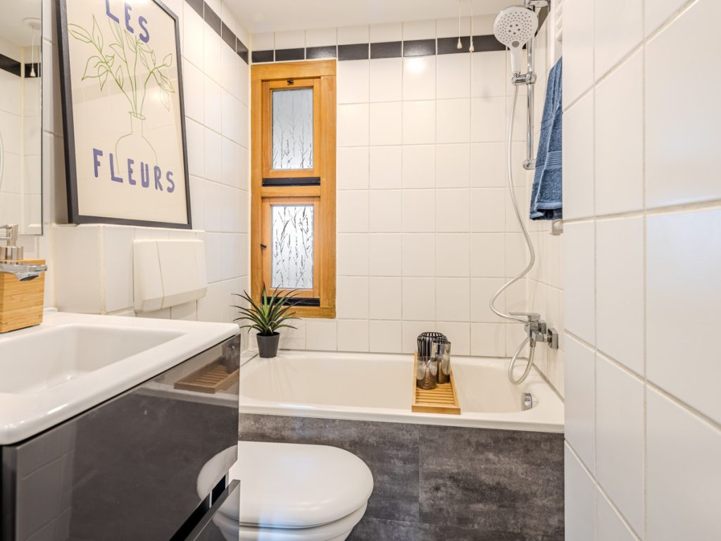 Das separate Gästebad wurde im Jahr 2025 mit einem dunklen Vinylboden, einem modernen Waschtisch mit Unterschrank und stilvollen Deckenspots ausgestattet.