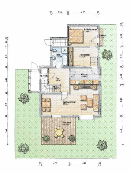 Der Garten, der zur unteren Wohneinheit gehört, wurde durch eine Holzterrasse und einer gemütlichen Sitzecke liebevoll gestaltet.