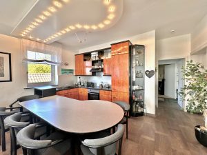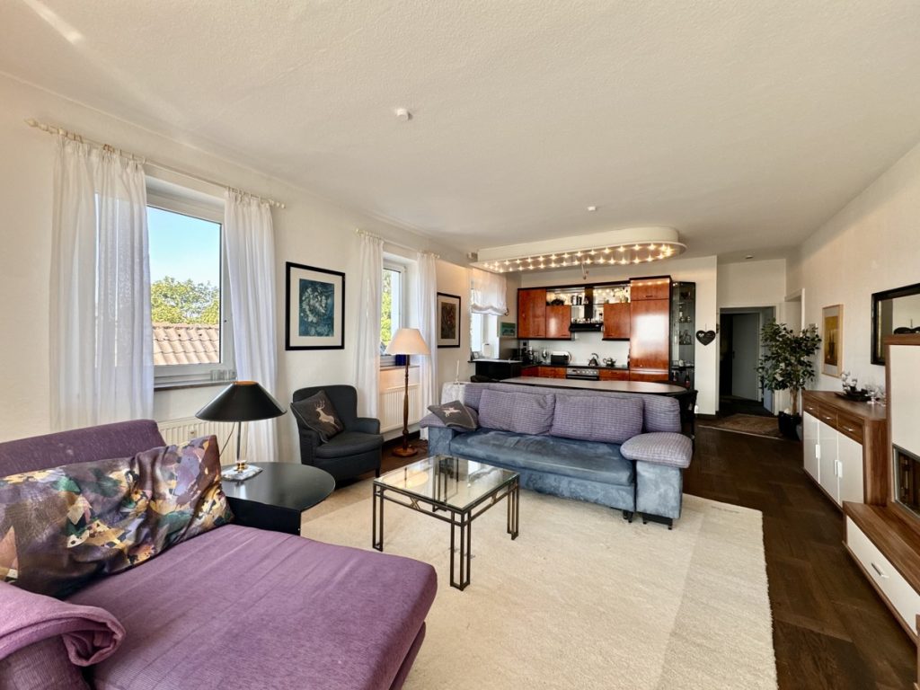Zu Ihrer Linken finden Sie den geräumigen Wohn-, und Essbereich mit einer Einbauküche, komplett ausgestattet mit hochwertigen Elektrogeräten und einem E-Herd. Dieser einladende Raum erstreckt sich über großzügige 40 qm und öffnet sich zu einem südlich ausgerichteten Balkon, der perfekt ist, um die frische Luft und die strahlende Sonne zu genießen.