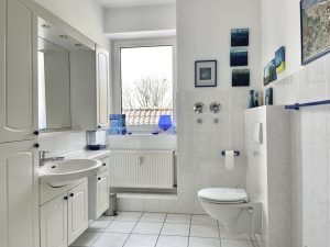 Zur rechten Seite der Garderobe erwartet Sie das gemütliche Schlafzimmer, das mit ca. 20 qm genügend Platz zum Entspannen bietet und durch ein Fenster mit natürlichem Licht durchflutet wird. Das Tageslichtbad ist hell gefliest und mit einer Dusche ausgestattet. In den Wohnräumen wurde edles, dunkles Holzparkett verlegt, was zu einer warmen und einladenden Atmosphäre beiträgt.