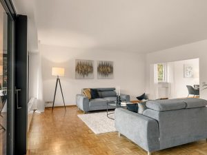 Das Herzstück der Wohnung bildet das große und lichtdurchflutete Wohnzimmer, welches Zugang zu der weitläufigen Loggia bietet.