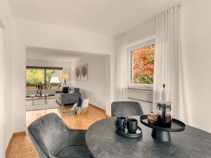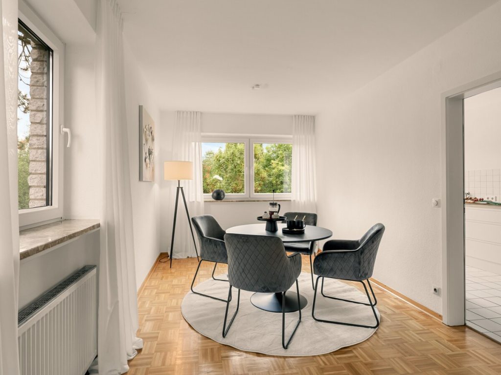 Direkt von der Küche aus erreichen Sie bequem den, zum Wohnzimmer geöffneten, Essbereich.