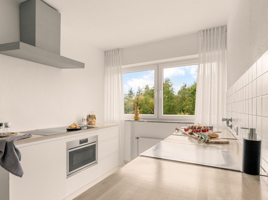 Betreten Sie die Wohnungen, empfängt Sie die helle Diele, welche über einen praktischen Abstellraum verfügt. Zur Rechten gelangen Sie zum Gäste-WC und zur Küche.